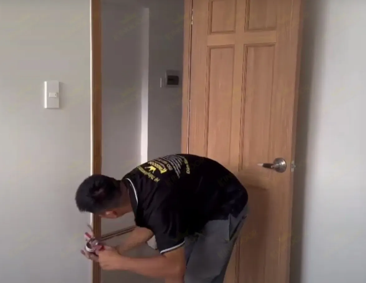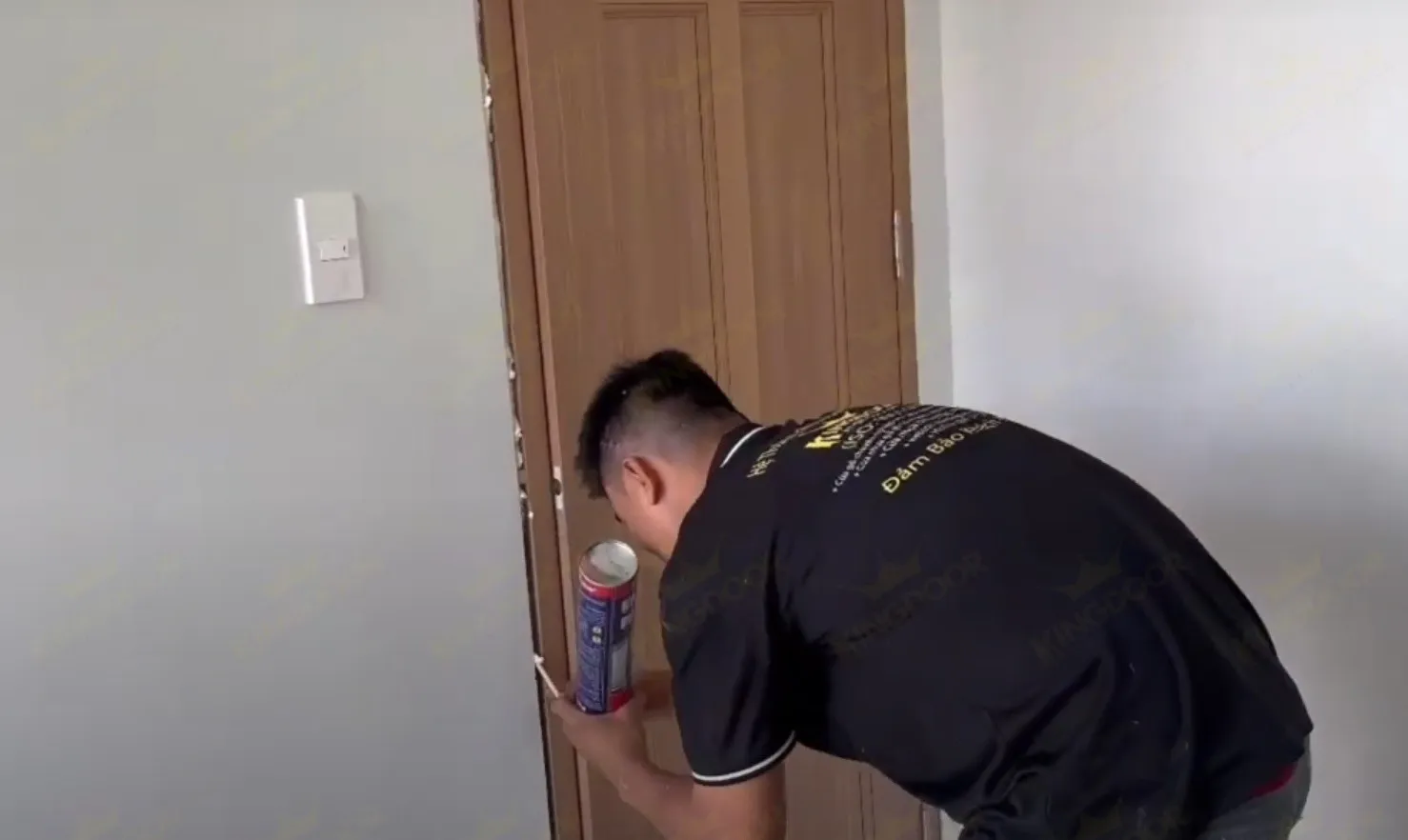 - Sau những bước ở trên, khung bao và ô tường có thể sẽ có những khe hở. Bởi vậy việc bắn keo foam có tác dụng che đi những kẽ hở này, đồng thời có tác dụng giữ cứng, cố định cửa.