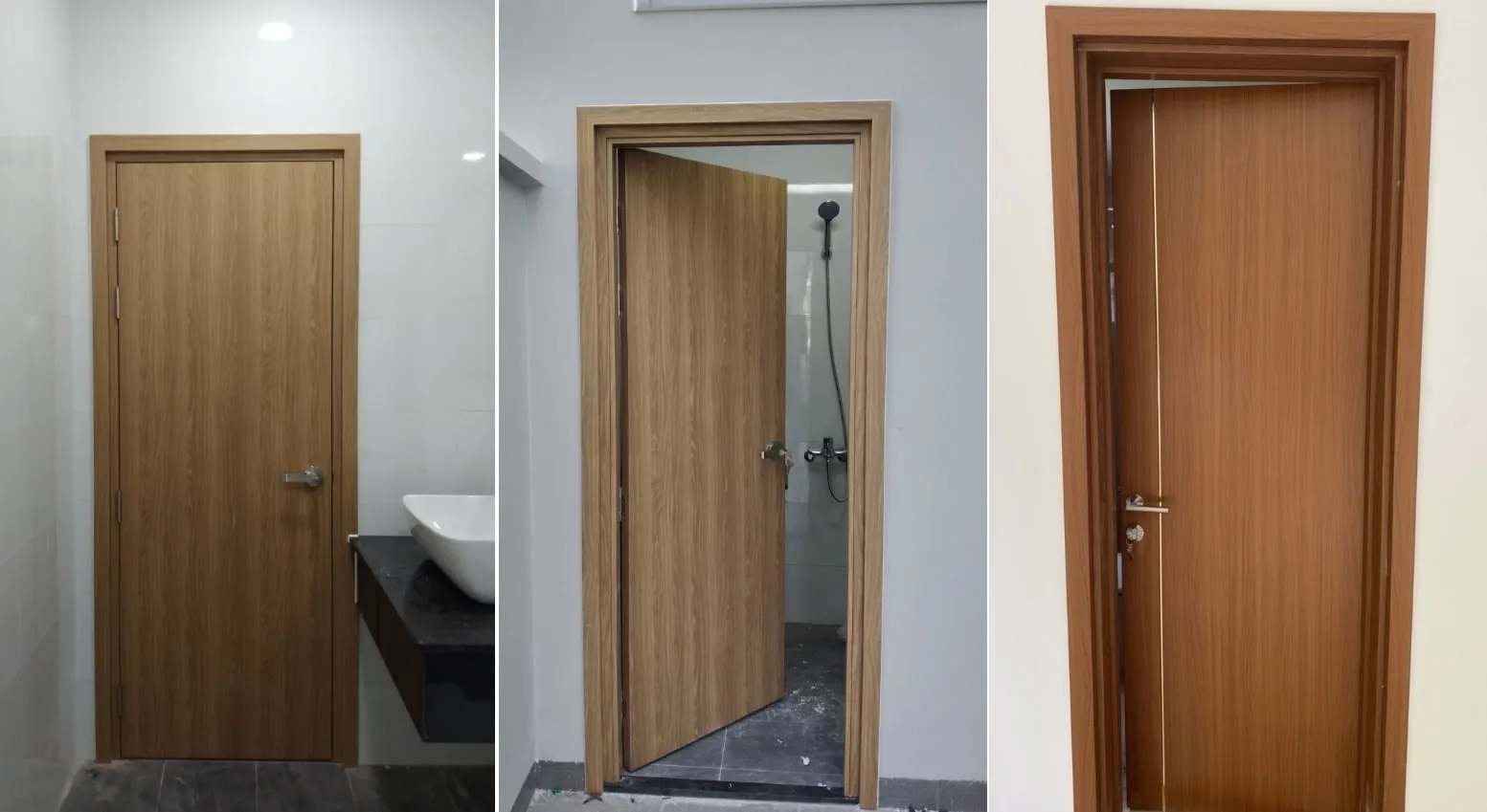 - Cửa nhà tắm cao cấp được làm từ chất liệu nhựa và bột gỗ đúc nguyên khối, đồng thời bề mặt cửa được phủ da, sơn PU và sơn vân gỗ. Dòng cửa này hiện nay đang được ưa chuộng bởi vì chống nước, chống mối mọt, chất lượng, bền , đẹp…