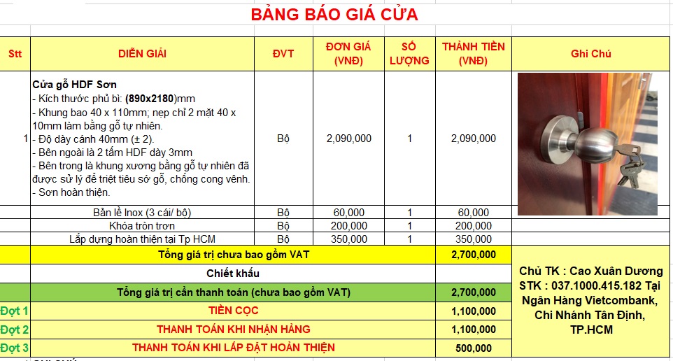 Giá cửa gỗ hdf sơn : 2.700.000/ bộ gồm cánh, khung bao, nẹp chỉ, khóa, bản lề, công lắp đặt hoàn thiện.
