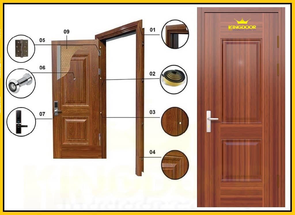 Cửa thép vân gỗ được cấu tạo từ 9 bộ phận : Khung cửa, cánh cửa, bản lề, khóa, ống nhòm,door sill, lõi cửa, gioăng cửa, lỗ đóng mở cửa …