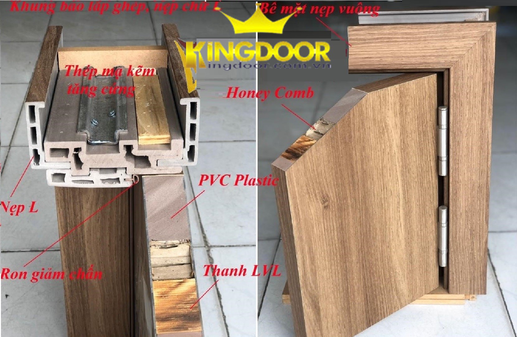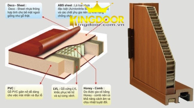 – Lớp giữa có gỗ PVC giãn nở được ép xung quanh cánh để tạo độ vững chắc và bắt khoá. Tiếp theo là LVL gỗ cứng được sếp thành nhiều lớp nhằm hạn chế tối đa việc giãn nở và cong vênh. Cuối cùng là Honey-Comb được gia cố ở giữa nhằm tối đa việc cách nhiệt và cách âm. Các lớp trên được liên kết với nhau bằng loại keo đặc biệt và được ép bằng máy ép thuỷ lực 7 tấn trong thời gian 10h, tạo ra cánh cửa dày 39mm, chắc chắn, không cong vênh…